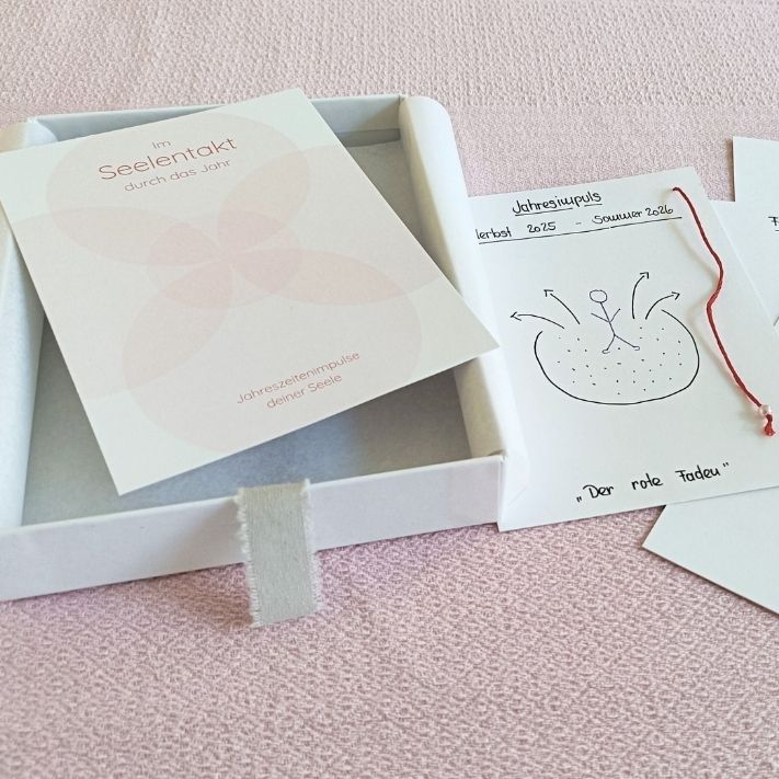 Zunächst erstelle ich den individuellen Jahreshauptimpuls deiner Seele, quasi den «roten Faden» für das Jahr. Diesen lasse ich dir zusammen mit der Seelenbox per Post zukommen.